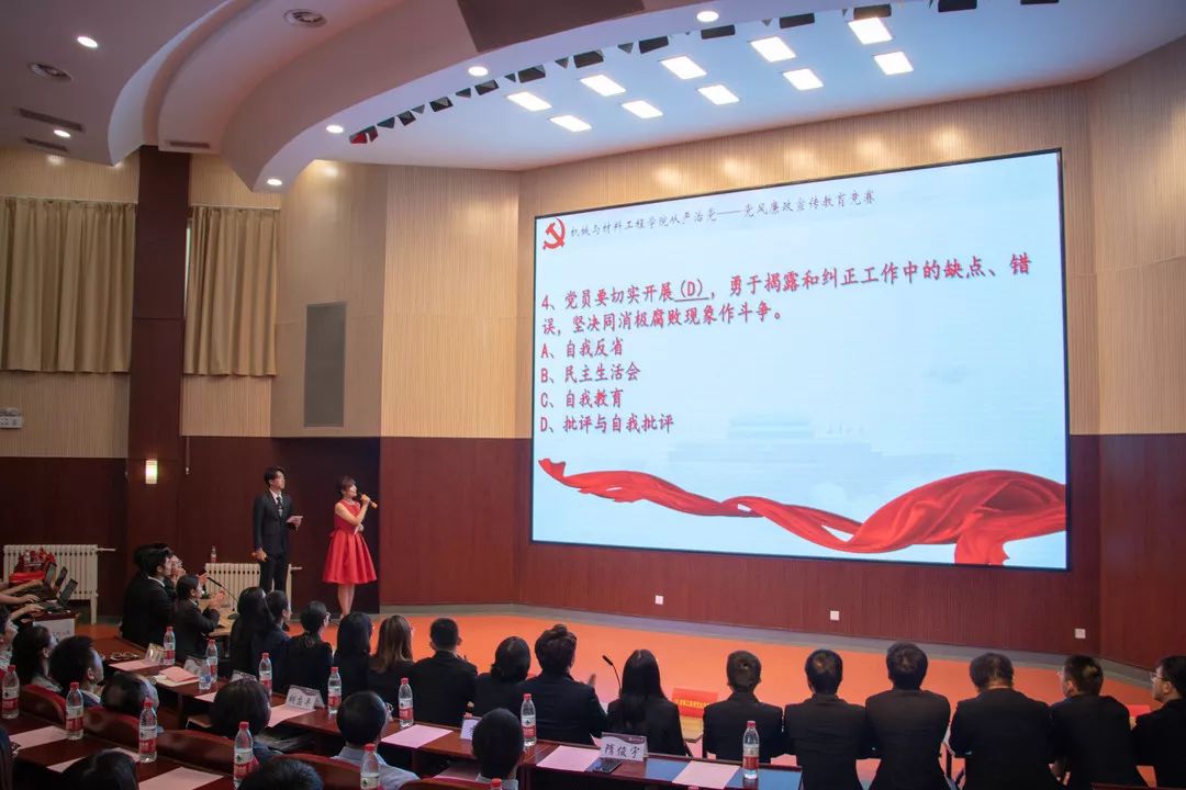 5月16日下午,機械與材料工程學(xué)院在文化會堂成功舉辦主題為從嚴(yán)治黨的黨風(fēng)廉政宣傳教育知識競賽。副校長胡應(yīng)平、紀(jì)委書記歐陽媛觀看競賽。校紀(jì)委辦公室副主任劉姝、機械與材料工程學(xué)院班子成員、學(xué)院各黨支部書記、各年級輔導(dǎo)員以及學(xué)生代表參加了活動。在詩朗誦《托起明天永遠(yuǎn)不落的太陽》之后,知識競賽正式開始。共有8只學(xué)生黨支部代表隊參加競賽,競賽分必答、搶答、選答三個環(huán)節(jié)。在必答題環(huán)節(jié),各隊選手漸入佳境,穩(wěn)扎穩(wěn)...