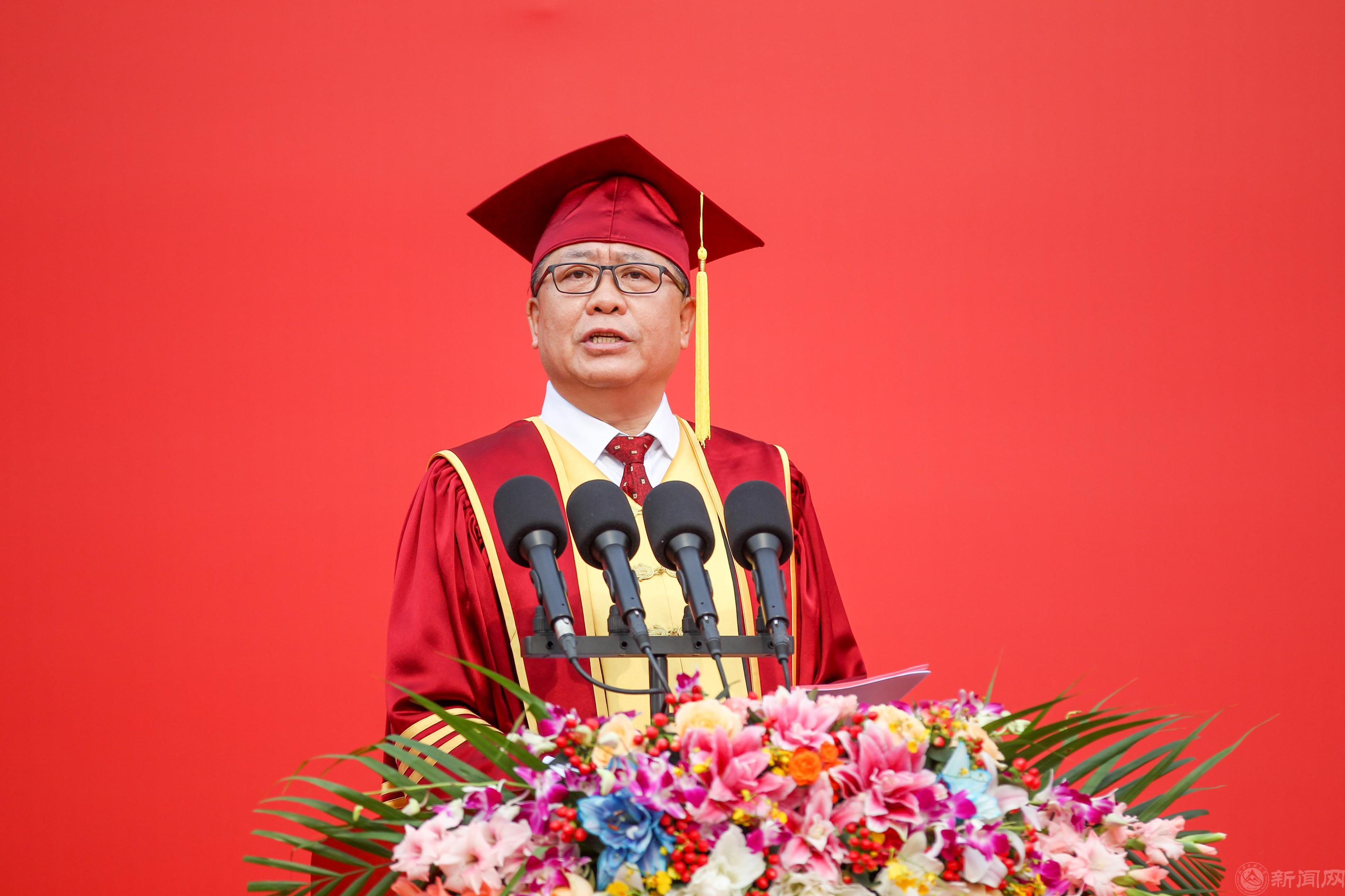 作為校長,我有幸吹過你吹過的青春之風,這就算相擁;我也走過你走過的毓秀小路,這就算相逢。從你們大學的時光里看到了我31年前大學畢業的影子,作為你們的師長和校長,在展望你們充滿機遇和挑戰的人生下一站的臨別之際,我送你們兩個關鍵詞“青春”和“友誼”,也和你們分享一些肺腑之言,希望能夠給予你們信心和力量,幫助你們勇敢面對前行道路上的每一次困難與挫折。就三句話: