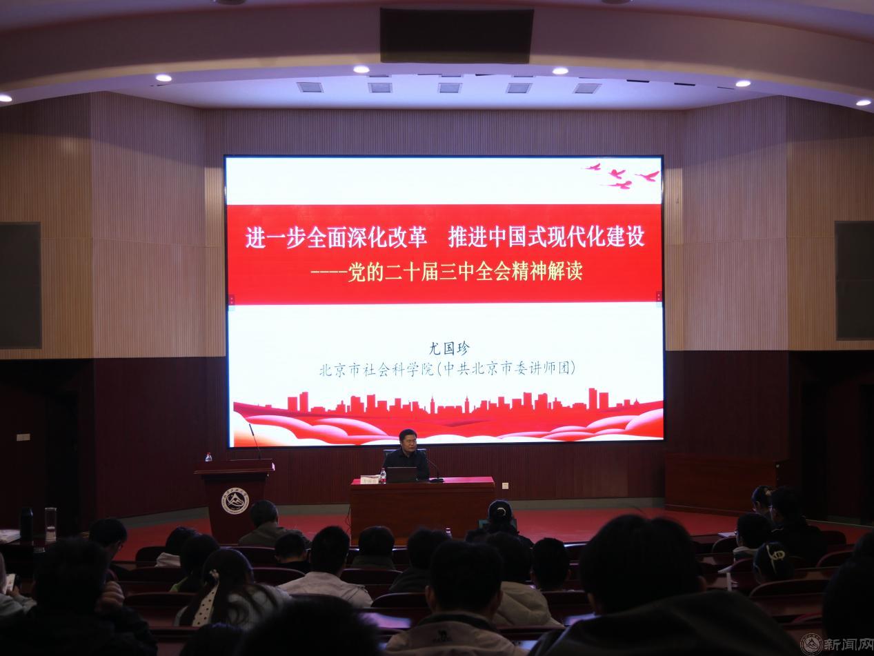 尤國珍教授以“進一步全面深化改革 推進中國式現(xiàn)代化建設(shè)”為主題,從深刻認(rèn)識黨的二十屆三中全會召開的時代背景、全面準(zhǔn)確理解《中共中央關(guān)于進一步全面深化改革、推進中國式現(xiàn)代化的決定》提出的重大舉措、深入學(xué)習(xí)貫徹習(xí)近平總書記重要講話精神等方面作了深入的宣講輔導(dǎo)。報告既有政治理論高度,又有現(xiàn)實關(guān)照,對于廣大師生深刻領(lǐng)會和把握黨的二十屆三中全會精神,以更加積極的姿態(tài)融入學(xué)校事業(yè)發(fā)展具有重要的指導(dǎo)意義。